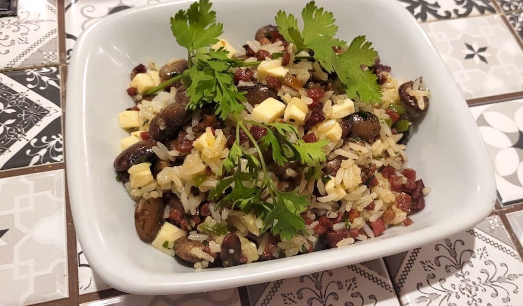 Baião de dois: fava, arroz, charque, linguiça, bacon e queijo coalho