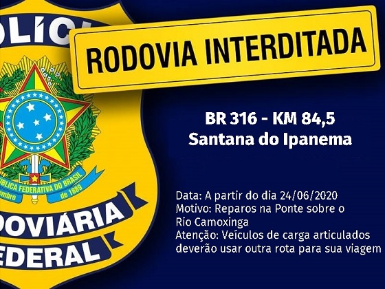A ponte sobre o Rio Camoxinga, localizada na BR-316, no município Santana do Ipanema, Sertão de Alagoas, segue interditada. De acordo com a Polícia Rodoviária Federal (PRF), a ponte está interditada para reparos e a via deve ser liberada no mês de agosto.
