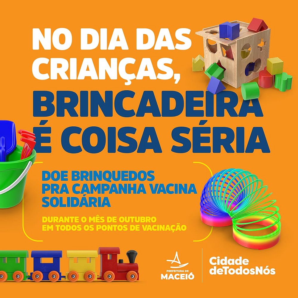 Em alusão ao mês das crianças, a campanha Vacina Solidária começou, nesta sexta-feira (1º), a arrecadar brinquedos para crianças e adolescentes assistidos pela Secretaria Municipal de Assistência Social (Semas) e por instituições socioassistenciais atuantes em Maceió. Como forma de prestar solidariedade, quem for se vacinar, acompanhar ou apenas visitar os locais de vacinação contra a Covid-19 pode contribuir com a doação.