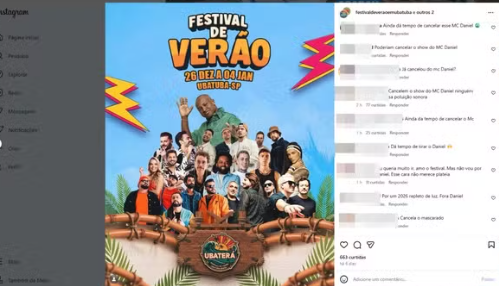 Já o anúncio Festival de Verão de Ubatuba não mostrou explicitamente o motivo. No entanto, a prefeita da cidade, Flávia Pascoal (PL), fez uma publicação nas redes sociais em que sugere que a decisão ocorreu em defesa das mulheres.