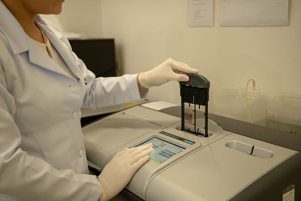A foto abaixo no Laboratório Martins Pinto, é referente à Pesquisa de bandas oligoclonais por isofocalização, realizado no líquor e sangue em conjunto, para pesquisa de esclerose múltipla.