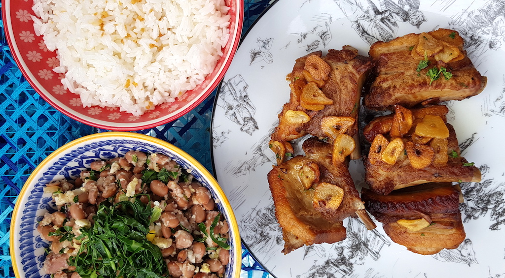 Costelinha suína com alho bem crocante, daquelas de roer o osso de tão gostosa. Na proposta do restaurante, a gente escolhe a proteína e quatro acompanhamentos