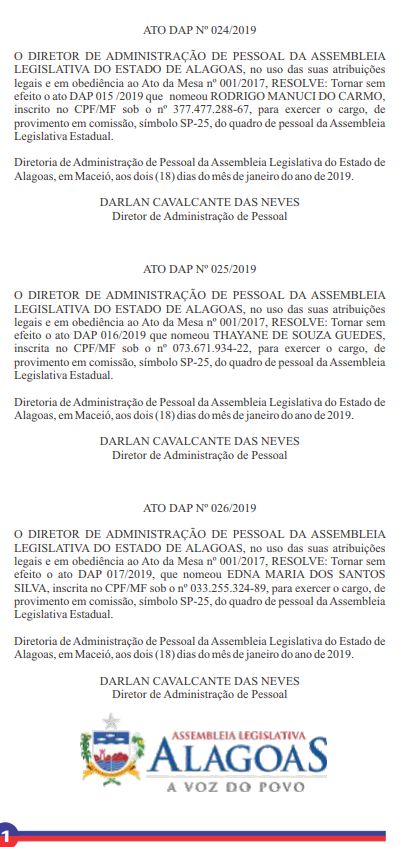 Os atos 24, 25 e 26 de 2019, tornaram nulas as nomeações de Rodrigo Manuci Carmo, Thayane de Souza Guedes e Edna Maria dos Santos Silva. Eles foram assinados pelo mesmo diretor que os nomeou para os cargos, Darlan Cavalcante das Neves, diretor de Administração de Pessoa da ALE.