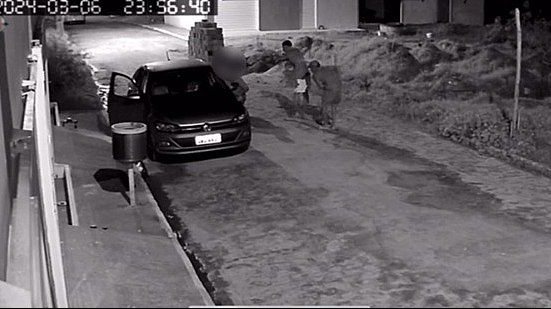 O homem apontado como mandante do crime aparece no vídeo, de bermuda escura e boné, atrás do adolescente autor dos disparos. É ele quem assume a direção do carro na fuga.