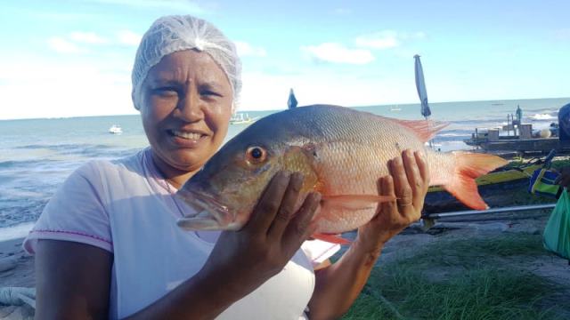 A chef Maria Paixão com o belo exemplar do peixe cioba direto do mar para cozinha