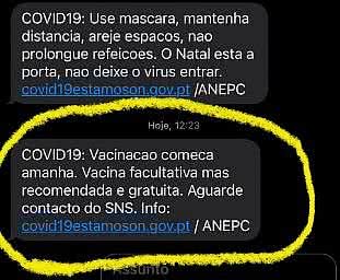 "COVID19: Vacinação começa amanhã. Vacina facultativa, mas recomendada e gratuita. Aguarde contacto do SNS", diz a mensagem enviada neste sábado, citando o Serviço Nacional de Saúde.