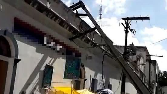 Um vídeo divulgado nas redes sociais mostra que o poste ficava do lado contrário da loja e caiu sobre o muro e telhado do imóvel, mas não causou grandes danos.