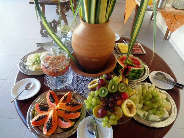 A gente se sente mesmo em casa, e até mais que isso, sente como quando um amigo recebe bem em casa, que acorda cedo e prepara um senhor café da manhã, para a gente dormir até mais tarde e acordar com café quentinho, bolo novo, sucos, pães, queijos, presuntos e a tapioca feita na hora.
