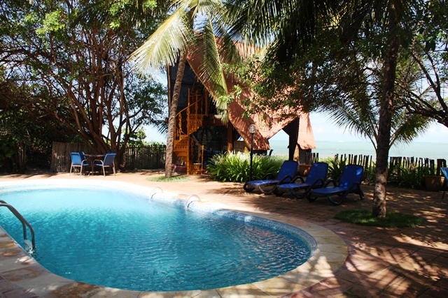 Na pousada tem piscina, sala de massagem, barraca de praia, sala de academia, recreadores para criançada, chalés que cabem a família com cozinha, sala de leitura.