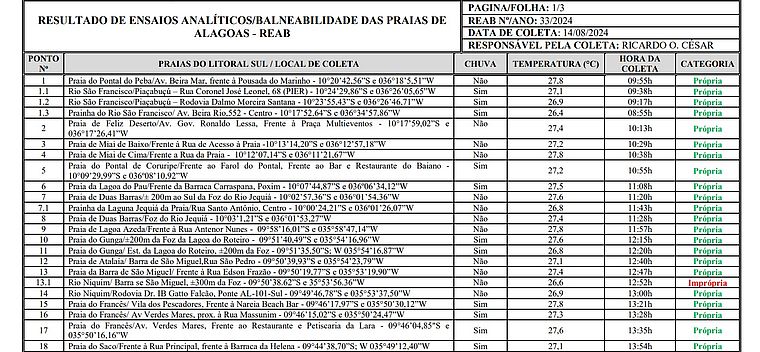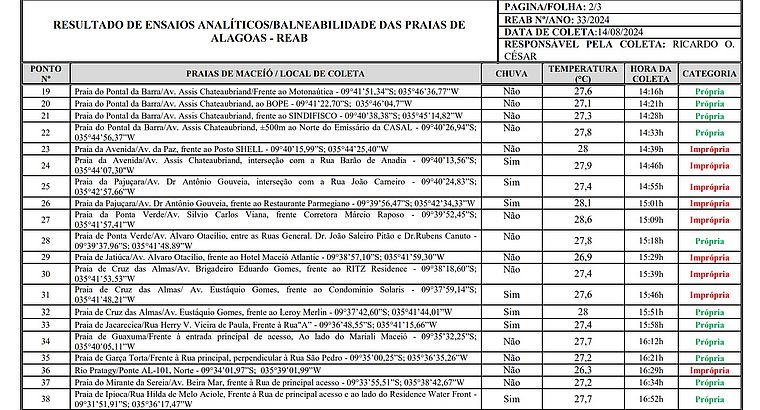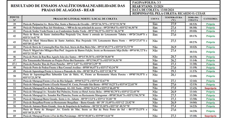 O relatório de balneabilidade das praias, divulgados pelo Instituto de Meio Ambiente de Alagoas (IMA), nesta sexta-feira, 16, aponta que 12 trechos de todo litoral alagoano estão impróprios para banho. A coleta das águas foi realizada por peritos do IMA entre terça, 13, e quarta-feira, 14.