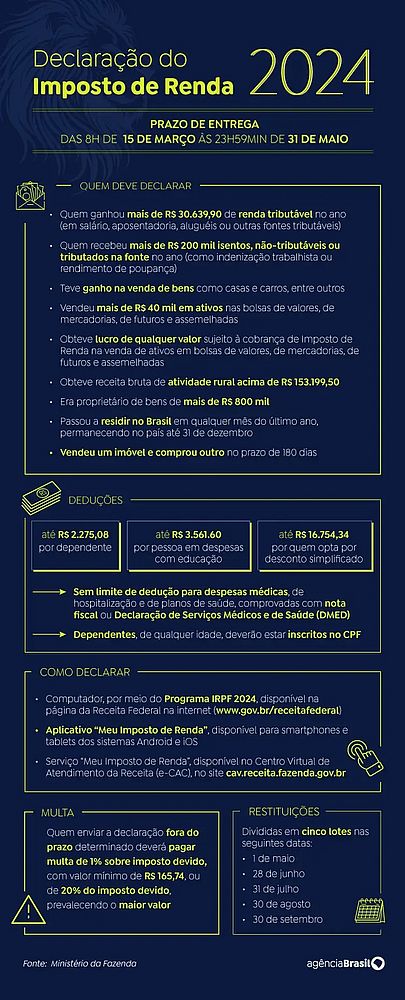 O prazo de entrega vai até 31 de maio, às 23h59min59s. Quem perder o prazo pagará multa de 1% sobre o imposto devido, com valor mínimo de R$ 165,74, ou 20% do imposto devido, prevalecendo o maior valor.