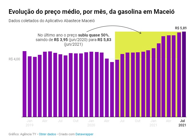 No último ano os brasileiros puderam sentir o impacto do aumento do preço da gasolina. Para os maceioenses não foi diferente e o valor do produto subiu em quase 50%. De acordo com os dados do Abastece Maceió, em junho de 2020 o preço médio do litro da gasolina na capital era de R$3,95; já em junho de 2021 o valor médio saltou para R$ 5,83, o que representa uma alta de 47,59%, em um ano.