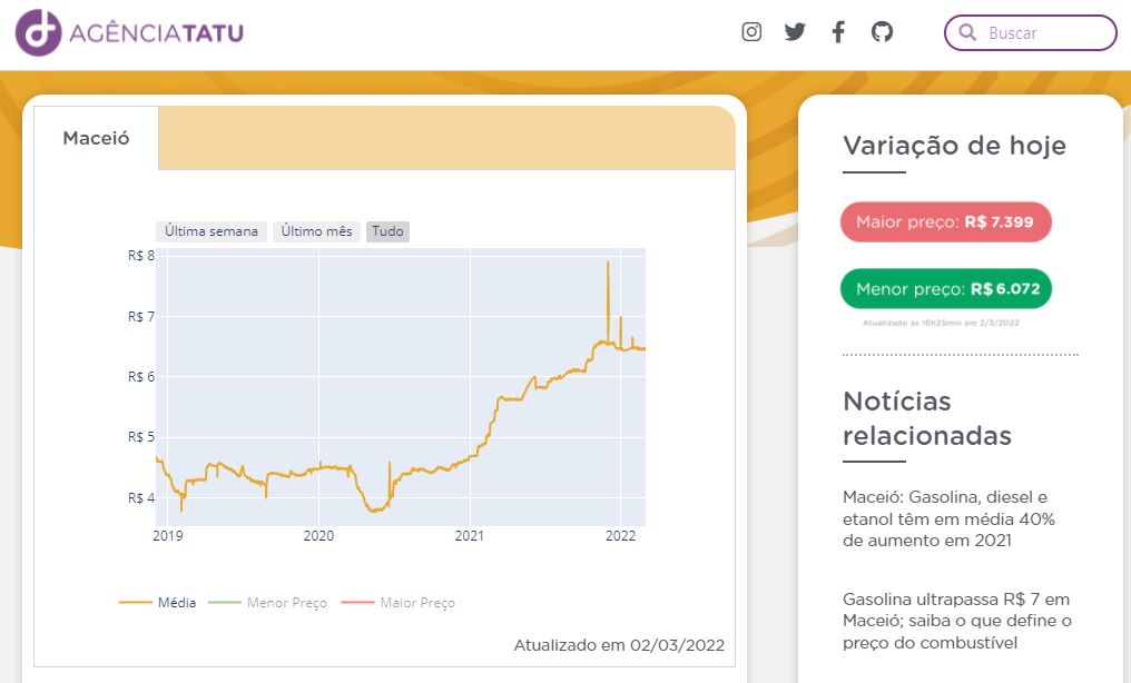 No dia 08 de fevereiro de 2021 o preço mais alto do litro da gasolina comercializado em Alagoas foi de R$ 5,399 e o menor R$ 4,599. Já este ano o preço maior está em R$ 7,39 e o mais barato R$ 6,07 segundo dados da Agência Tatu, veja: