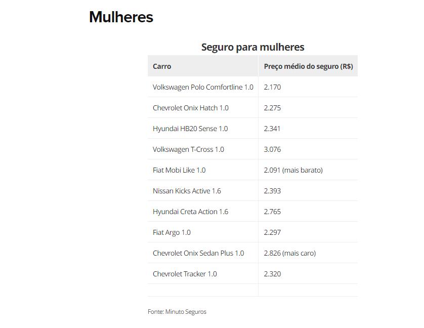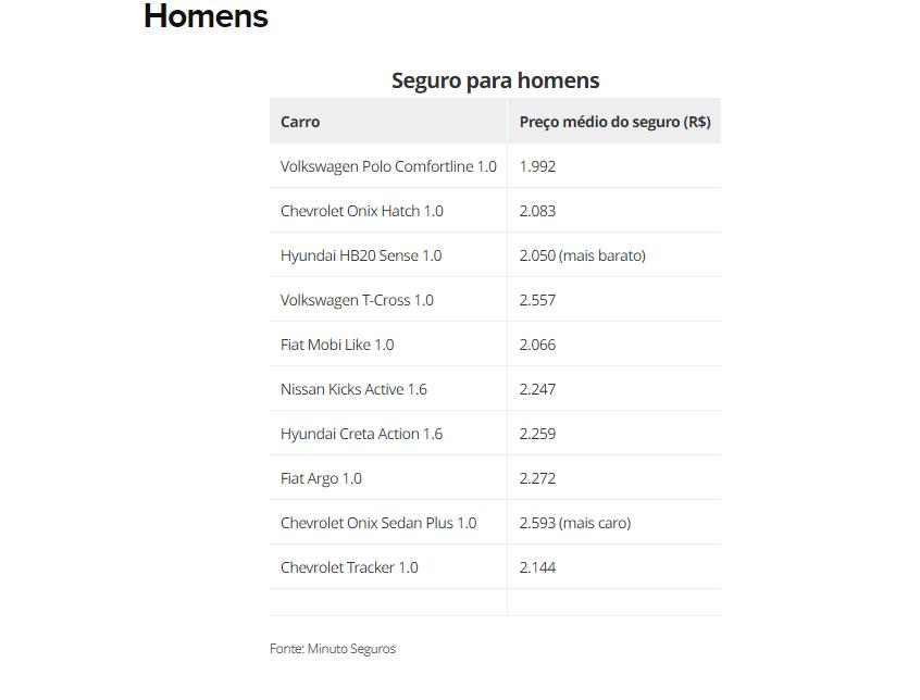 Para as mulheres, o Fiat Mobi Like 1.0 tem o valor médio da apólice mais barato, de R$ 2.091, enquanto o Volkswagen T-Cross 1.0 tem o valor mais caro, de R$ 3.076, e mesmo assim está entre os mais vendidos. Para os homens, o Hyundai HB20 Sense 1.0 tem o custo médio do seguro mais barato, de R$ 2.050, enquanto o Chevrolet Onix Sedan Plus 1.0 tem o custo médio do seguro mais caro, de R$ 2.593.