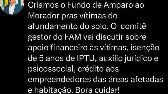Conforme anunciado pelo prefeito, nas redes sociais, o programa será gerido por um comitê e vai discutir apoio financeiro às vítimas, isenção de cinco anos do IPTU, apoio jurídico e psicossocial, e crédito aos empreendedores das áreas afetadas.