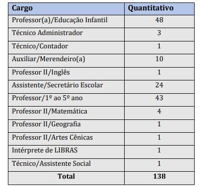De acordo com as publicações que constam no Diário oficial do Município (DOM) de hoje, foram nomeados 48 professores para a área de Educação Infantil; 43 professores do 1º ao 5º ano; 24 secretários escolares; dez merendeiros; quatro professores de matemática; três administradores; e um nome para os cargos de contador, professor de Inglês, professor de Linguagem Brasileira de Sinais (Libras), professor de Artes, professor de Geografia e de assistente social.