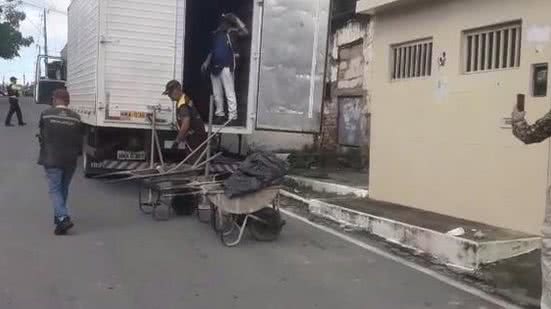 As imagens mostram agentes conversando com responsáveis pela obra e recolhendo equipamentos, que foram colocados dentro de um caminhão. O destino do material não foi informado.