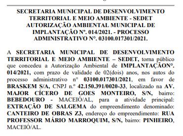 Foi publicado no Diário Oficial do Município, nesta sexta-feira, 09, a concessão de autorização ambiental de implantação para a Braskem no bairro do Pinheiro, bairro afetado, justamente, pela instabilidade do solo devido ao trabalho de extração de sal-gema.