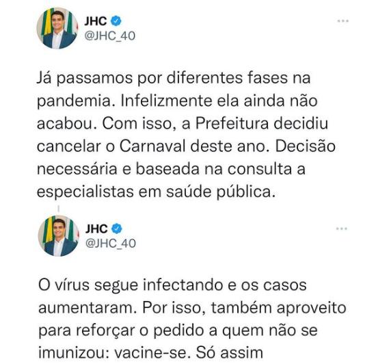 O anúncio foi feito pelo Prefeito JHC em suas redes sociais, onde ressalta que a pandemia ainda não acabou, e que a decisão foi tomada com base em consulta a especialistas em saúde pública.