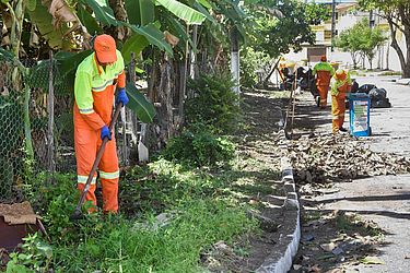 Mais de 90 agentes de limpeza participam da ação com serviços de capinação, roçagem, limpeza de bueiros, pintura de meio fio, coleta de resíduos domiciliares e nos pontos crônicos, contando com a utilização de retroescavadeira e caçambas para auxiliar no recolhimento de entulhos.