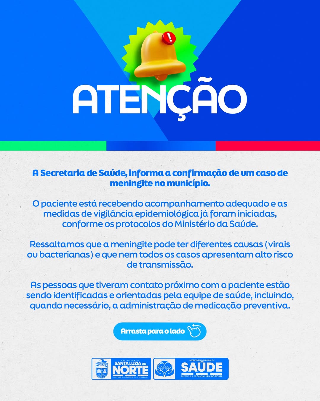 "O paciente está recebendo todo o acompanhamento necessário, e as medidas de vigilância já foram iniciadas, seguindo os protocolos do Ministério da Saúde. Ressaltamos que a meningite pode ter diferentes causas (virais ou bacterianas) e que nem todos os casos apresentam alto risco de transmissão. As pessoas que tiveram contato próximo com o paciente estão sendo identificadas e orientadas pela equipe de saúde, incluindo, quando necessário, a administração de medicação preventiva", diz a nota publicada pela Prefeitura de Santa Luzia do Norte.