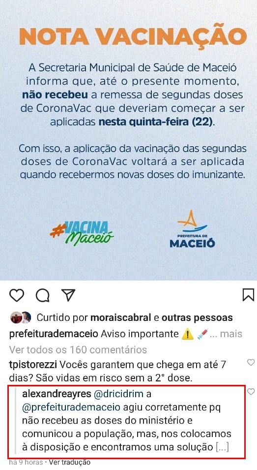 "Boa Noite! Acabei de receber uma ligação do governador Renan Filho sobre a nota da prefeitura dae Maceió que suspende a aplicação da segunda dose de CoronaVac pelo atraso no envio de doses do Ministério da Saúde. Recebi orientação para que buscássemos uma solução conjunta que garantisse as doses para nossos idosos e conseguimos!!! A nossa prioridade é a saúde da nossa gente e amanhã tem vacinação, sim!" diz o texto do secretário, que chegou a responder um internauta no perfil da prefeitura na mesma rede social, ponderando que "a prefeitura agiu corretamente... mas nos colocamos à disposição para buscar uma solução conjunta".