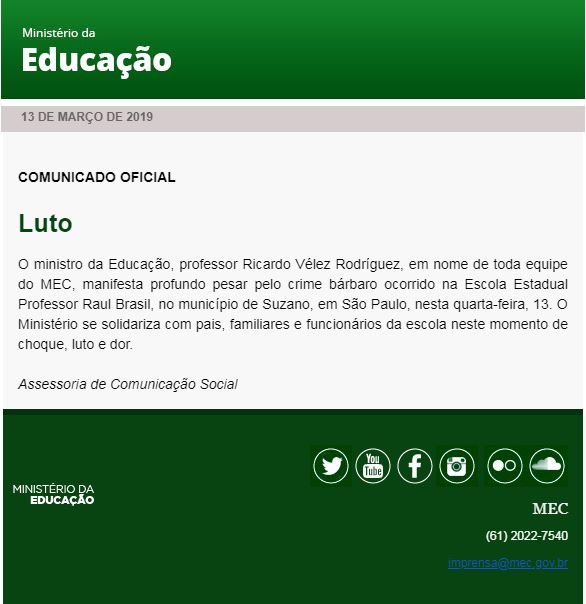Mais cedo, o Ministro da Educação, Ricardo Velez, repudiou o massacre e publicou uma mensagem de luto oficial através dos canais do Ministério.