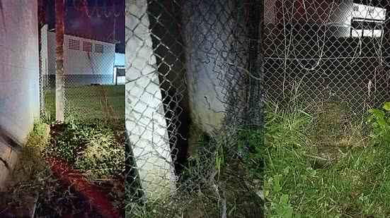 No mês passado, uma câmera de monitoramento flagrou o momento em que um homem aparece cortando as telas e passando por dois bloqueios com grades na mesma unidade prisional. As imagens mostram que ele vai agachado até a tela, mexe nela e depois retorna às pressas. Veja a seguir.