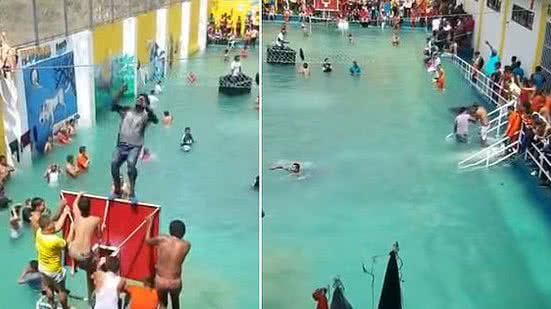 Vários vídeos circularam na internet mostrando os detentos nadando no parque aquático improvisado. Alguns pulam das traves, cestas de basquete e outras superfícies acima do nível da água. Tem até um preso que dá um mortal, parecendo estar se divertindo muito.