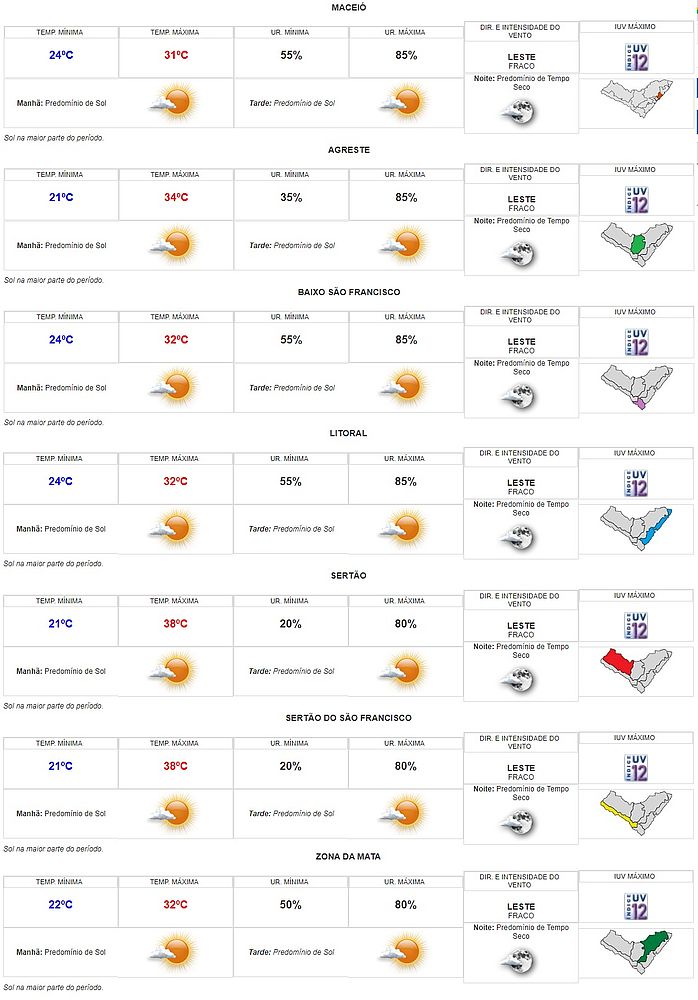 Em Maceió, as temperaturas podem variar entre 24ºC e 31ºC durante todo o dia 26. Já a temperatura máxima esperada para o Sertão é de 38ºC, ou seja, os moradores da região devem enfrentar forte calor neste domingo. Quem mora no Agreste também pode encarar temperatura alta.
