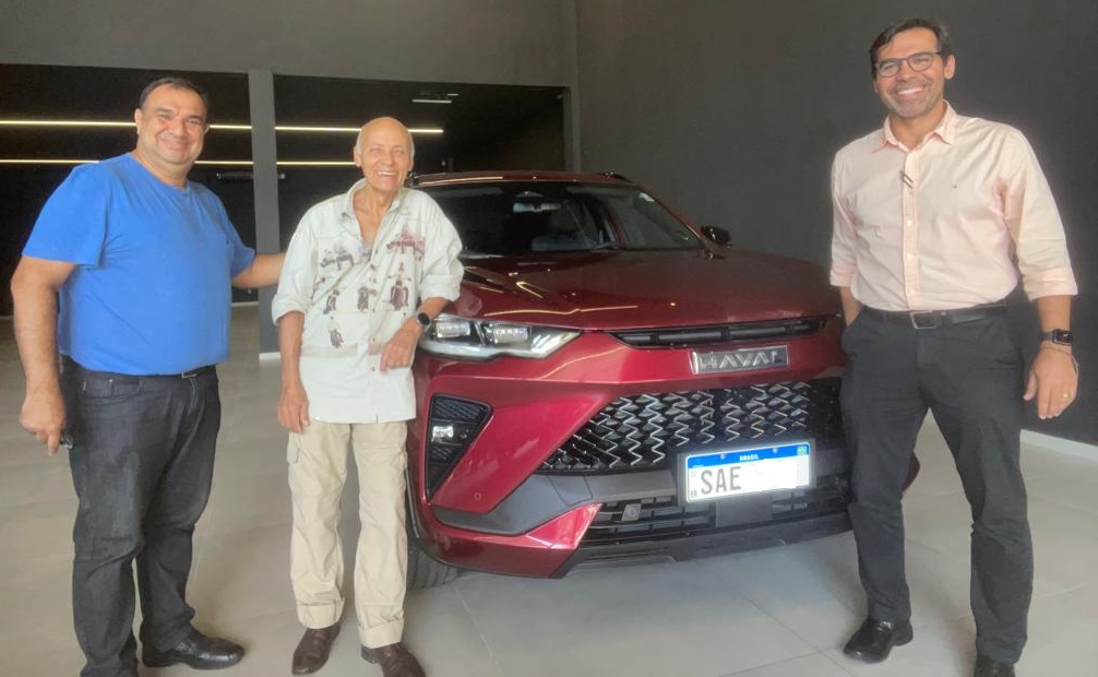 Nelson Calazans é o primeiro cliente da GWM em Alagoas a receber o Haval H6 GT ao lado do vendedor Glênio e o gerente Julinho Silveira da GWM Cycosa