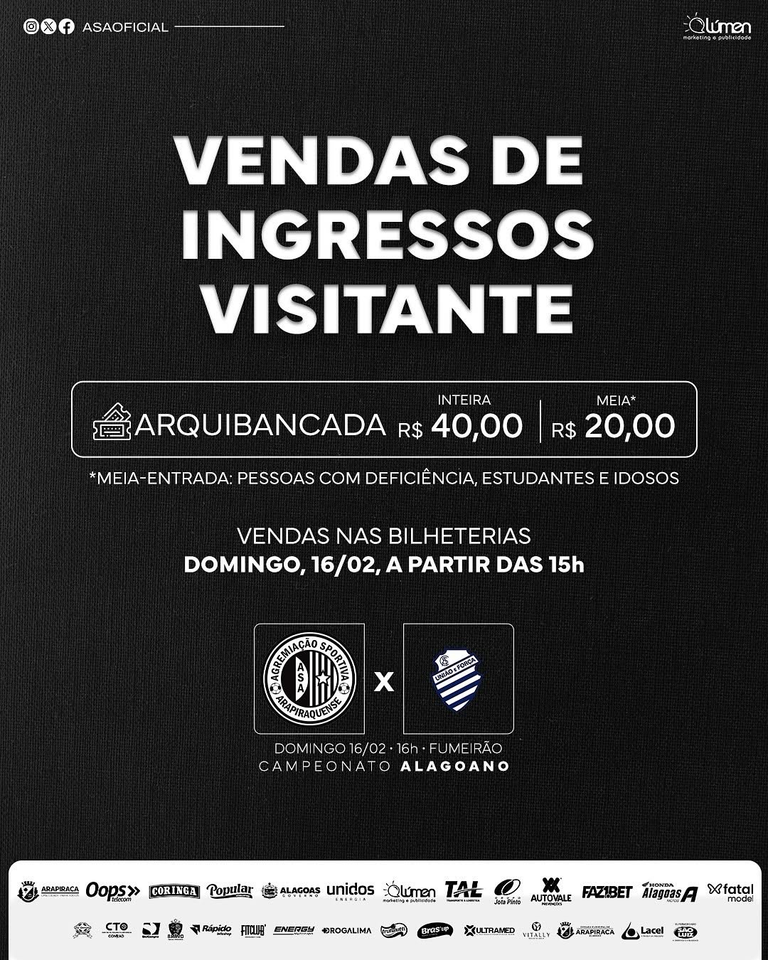 Nessa quinta-feira (13), o ASA publicou que, na bilheteria do estádio, os ingressos para os visitantes (inteira e meia) serão vendidos às 15h do domingo - uma hora antes da bola rolar. Para os torcedores do alvinegro, a venda física começou nesta sexta (14).