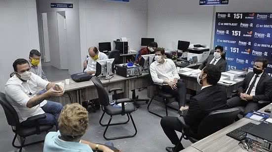 O diretor-presidente do Procon/AL, Daniel Sampaio, se reuniu ontem (8) com a secretária-executiva do Sindicato dos Estabelecimentos de Ensino do Estado de Alagoas (Sinepe/AL), Lavínia Galindo, com o presidente do Sindicato dos Professores (Sinpro), Eduardo Vasconcelos, com dois representantes de pais de alunos, Alessandro Tavares e Manoel Pinto, e com o presidente OAB-AL, Nivaldo Barbosa, junto do diretor de Comissões da OAB-AL, Marcos Mero.