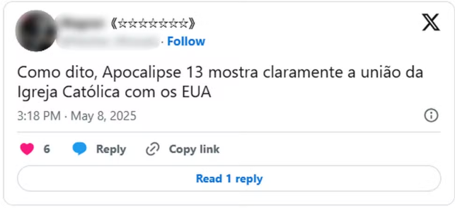 Como Leão XIV, novo líder da Igreja Católica, é nascido nos Estados Unidos, país mais poderoso do mundo, esse trecho é interpretado como um sinal do fim dos tempos.
