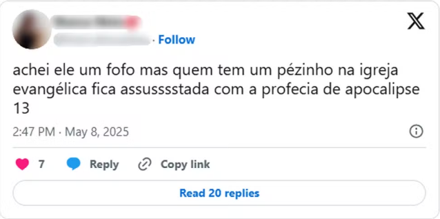 As postagens nas redes sociais também fazem referência a esse fato, para associar o novo papa ao anticristo. Inclusive pelo fato de ele ser Leão XIV, que se segue ao número 13 do capítulo em questão.