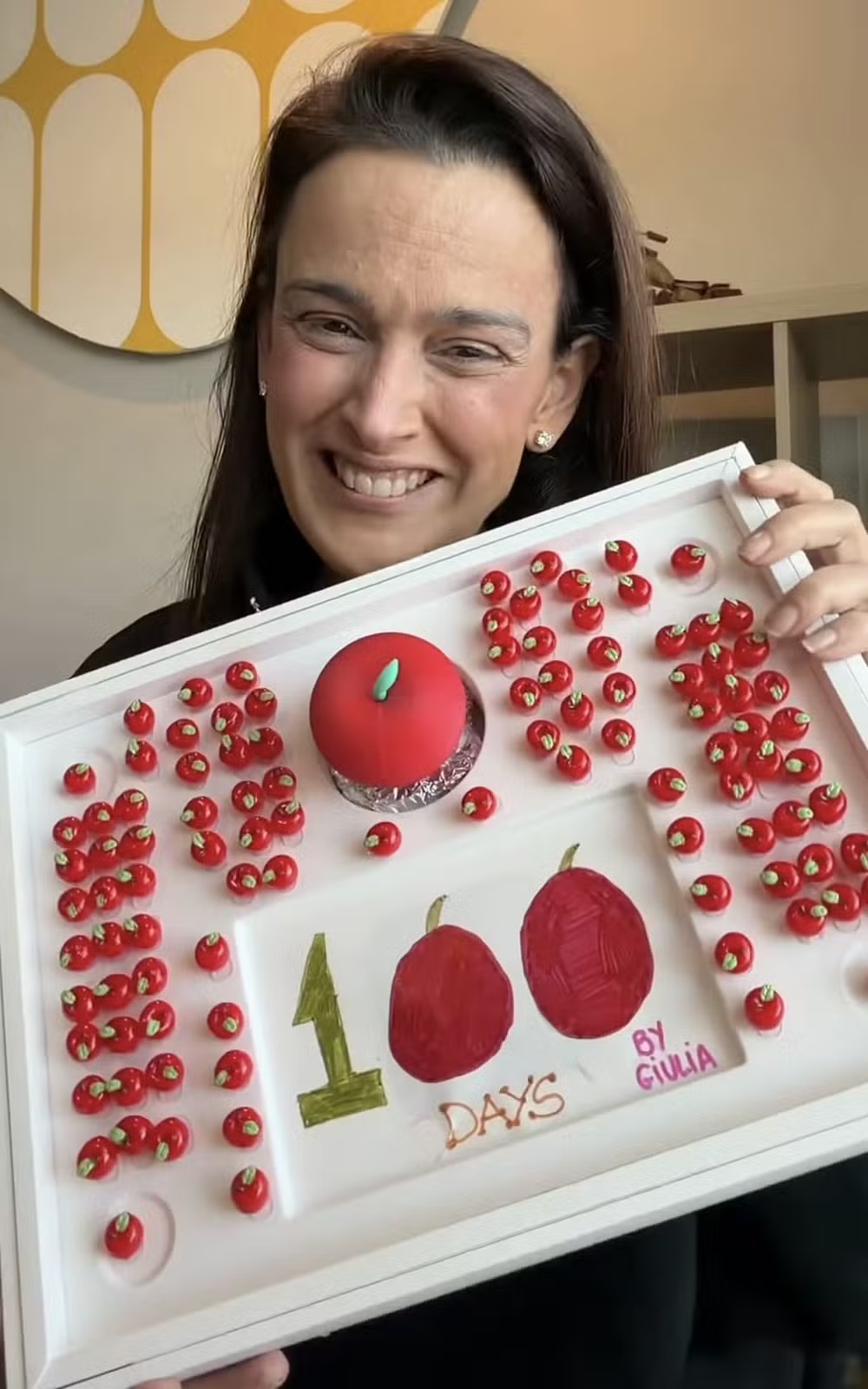 "Eu queria que ela percebesse de uma forma sutil que eu não achei bacana. Eu pensei: vou enviar 100 maçãs e a centésima vai ser exatamente a maçã que ela recusou", diz. Ela e a filha imprimiram 99 maçãs pequenas na impressora 3D e, como planejado, a última maçã foi uma réplica do presente que ela fez para a professora.