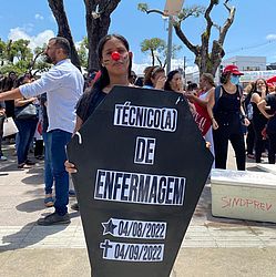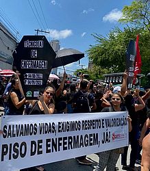 Com cartazes e caixões para demonstrar a indignação, profissionais da saúde realizaram um novo protesto na manhã desta quarta-feira, 21, contra a suspensão do piso salarial da enfermagem por decisão do Supremo Tribunal Federal (STF). A manifestação reivindica, além do piso salarial, condições mínimas de trabalho para os enfermeiros, auxiliares e técnicos de enfermagem.