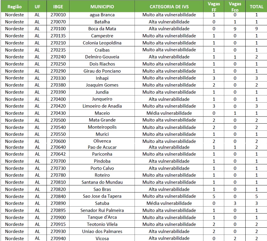 O Ministério da Saúde publicou um novo edital com a abertura de mais 3,1 mil vagas para o Programa Mais Médicos. Nesta edição, de forma inédita, serão disponibilizadas vagas no regime de cotas para pessoas com deficiência e grupos étnico-raciais, como negros, quilombolas e indígenas. Com o aumento do número de profissionais na rede pública de saúde, mais de 10,6 milhões de brasileiros serão beneficiados. Em Alagoas, serão oferecidas 61 vagas distribuídas em 37 municípios do estado.