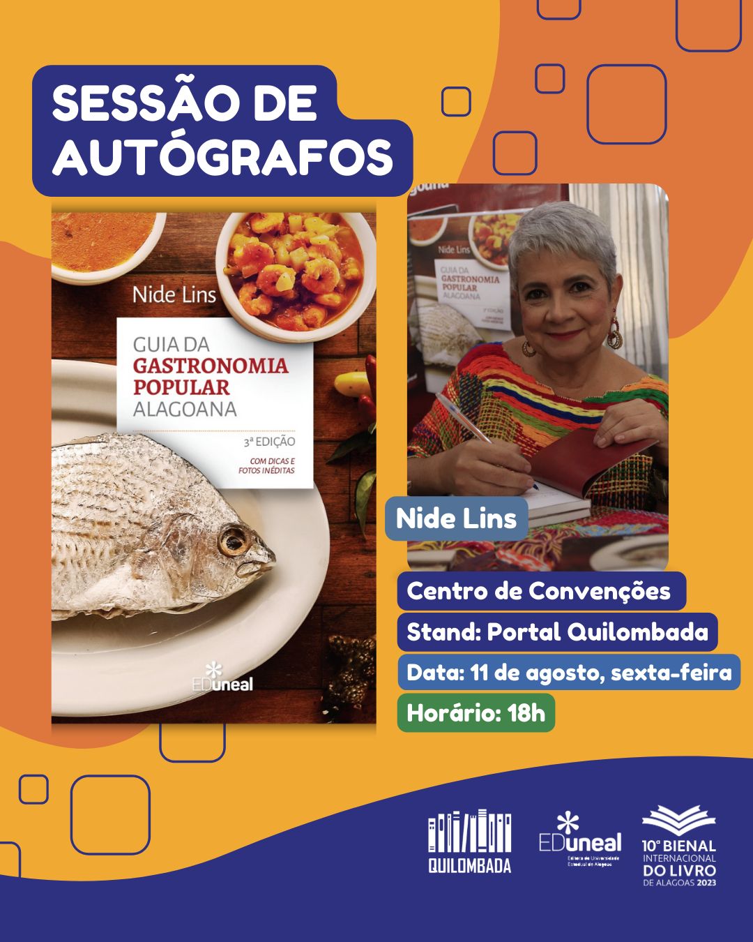 Vai ter promoção na 10ª Bienal do Livro de Alagoas. A 3ª edição do Guia de Gastronomia Popular Alagoana da Editora da Universidade Estadual de Alagoas (Eduneal) será comercializado por R$ 35,00, com direito ao meu autografo, nesta sexta-feira, 11, das 18h às 21h, no stand Portal Quilombada, no Centro de Convenções. Com o apoio do Governo do Estado foram impressos mais livros que norteiam alagoanos e turistas que desejam seguir a rota das tradições em Alagoas.