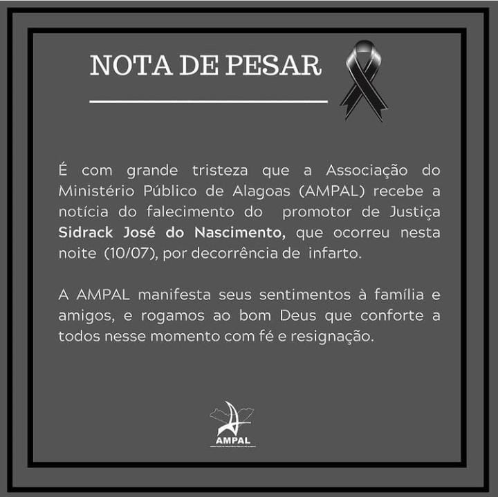 O promotor de Justiça Sidrack Nascimento faleceu neste sábado (10). Em nota, a Associação do Ministério Público de Alagoas (AMPAL) lamentou a morte, que teria ocorrido por conta de um infarto.