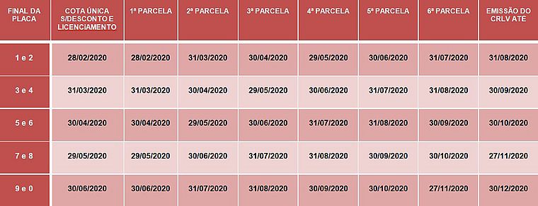 Cada final de placa possui uma data-limite para pagamento da cota única sem desconto ou da primeira parcela. As placas de finais 1 e 2 têm até 28 de fevereiro; placas de finais 3 e 4 até 31 de março; placas de finais 5 e 6 até 30 de abril; placas de finais 7 e 8 até 29 de maio e as placas de finais 9 e 0 até 30 de junho. O valor mínimo de cada parcela – que pode ser dividida em até seis vezes – não poderá ser inferior a R$ 100.