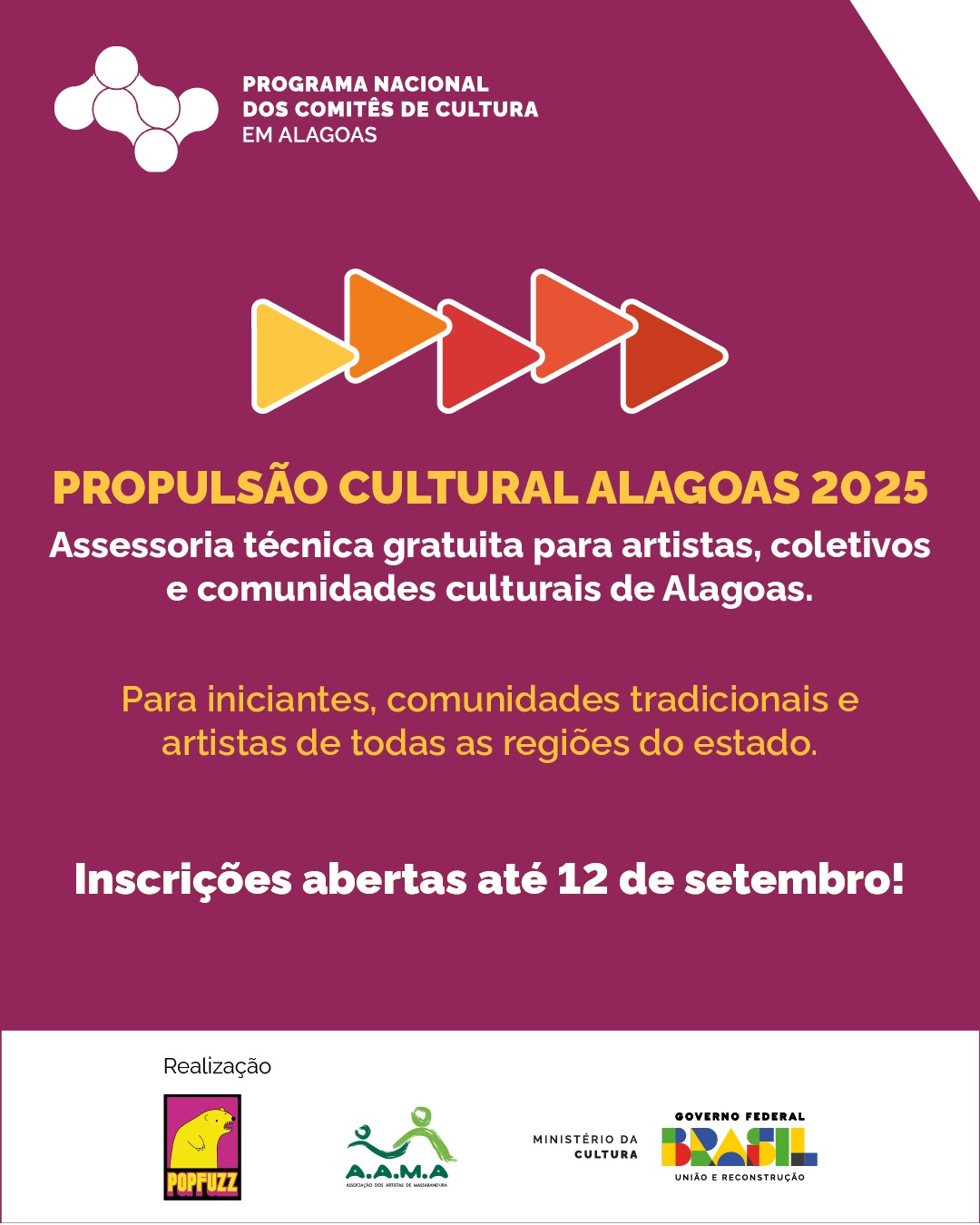 As inscrições estão abertas até o dia 12 de setembro, basta preencher o formulário simplificado através do link https://bit.ly/4mS9sn0 ou entre em contato com o Comitê de Cultura em Alagoas pelo WhatsApp no número (82) 98854-4782. Se você é artista, faz parte de um coletivo ou integra uma comunidade tradicional, não perca essa oportunidade. O Propulsão Cultural está pronto para apoiar sua caminhada e fortalecer sua voz dentro da cultura alagoana. Participe, inscreva-se e faça parte dessa transformação!