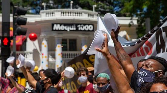 Representantes de entidades do movimento negro fizeram um protesto na manhã desta quinta-feira (18) na avenida Paulista, em São Paulo, pela prorrogação do auxílio emergencial no valor de R$ 600 até o fim da pandemia.