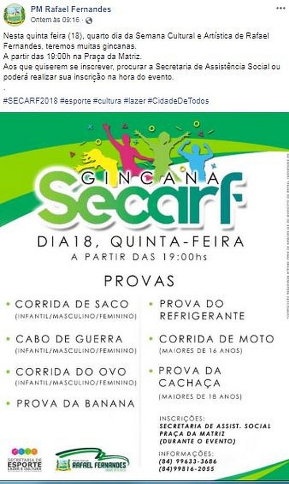A gincana chegou a ser divulgada nas redes sociais da Prefeitura Municipal de Rafael Fernandes. Além da prova da cachaça, havia ainda uma corrida de moto ao redor da praça central da cidade. O detalhe é que a corrida abria vagas para maiores de 16 anos, sendo que, por lei, só podem pilotar veículos automotores maiores de 18 anos.