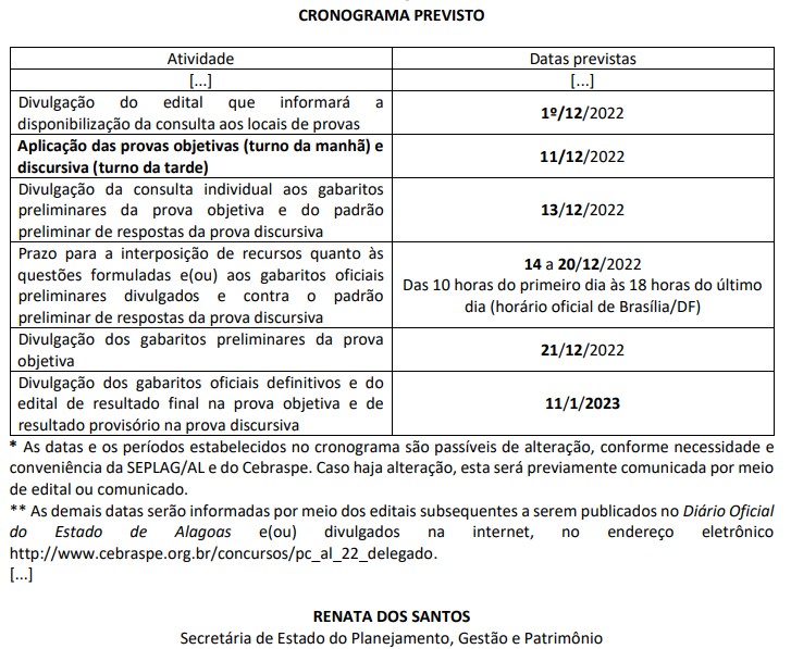 A Secretaria de Planejamento, Gestão e Patrimônio de Alagoas (Seplag-AL), comunica que, devido as ocorrências nos últimos concursos da área de Segurança Pública e consequente instauração de inquéritos policiais para investigação das fraudes, vimos a necessidade, juntamente com o Centro Brasileiro de Pesquisa em Avaliação, Seleção e Promoção de Eventos (Cebraspe), de prorrogar, inicialmente, a data das provas para aprimorar as medidas de segurança do evento. Enfatizamos, ainda, que a escolha dos dias 11 e 18 de dezembro de 2022, se dá em decorrência da indisponibilidade de locais para aplicação das provas, posto que em novembro, outros exames nacionais ocorrerão, a exemplo do Enem e do Enade.