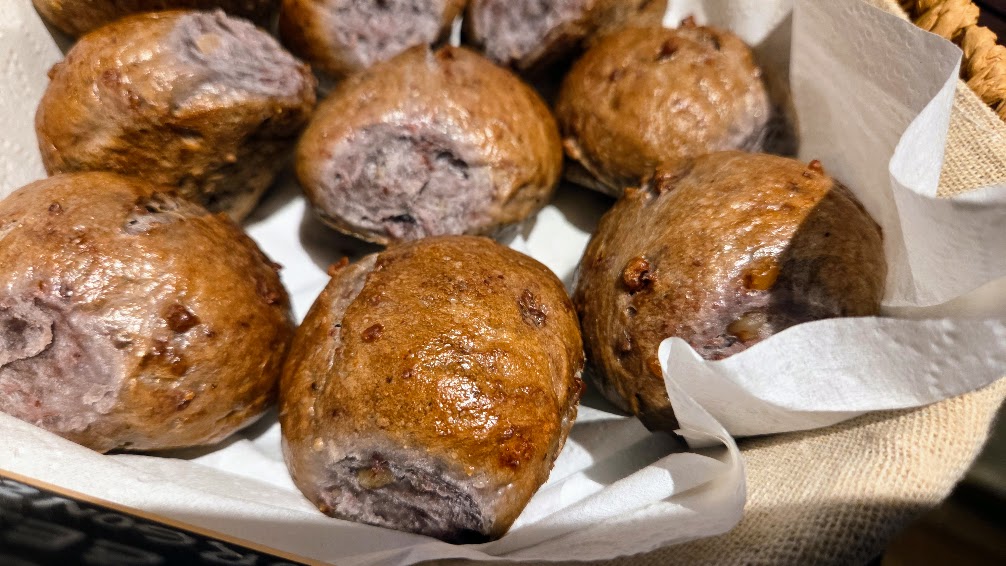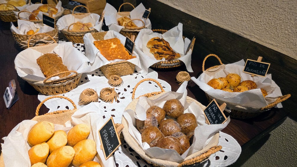 No café da manhã, uma seleção de pães de fermentação natural que transforma qualquer xícara em ritual. Os pãezinhos de queijo são queridinhos do público. E o redondinho de batata com queijo coalho é puro conforto: macio, quentinho, com recheio que puxa e conquista.