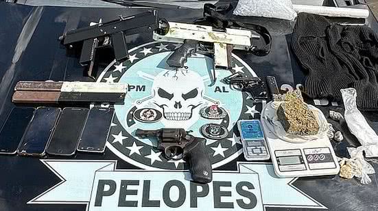 Além das armas e dos acessórios, a polícia recolheu 206g de maconha, 18g de crack, duas balanças de precisão, três balaclavas, diversos pinos vazios, material para embalagem, e quatro telefones celulares.