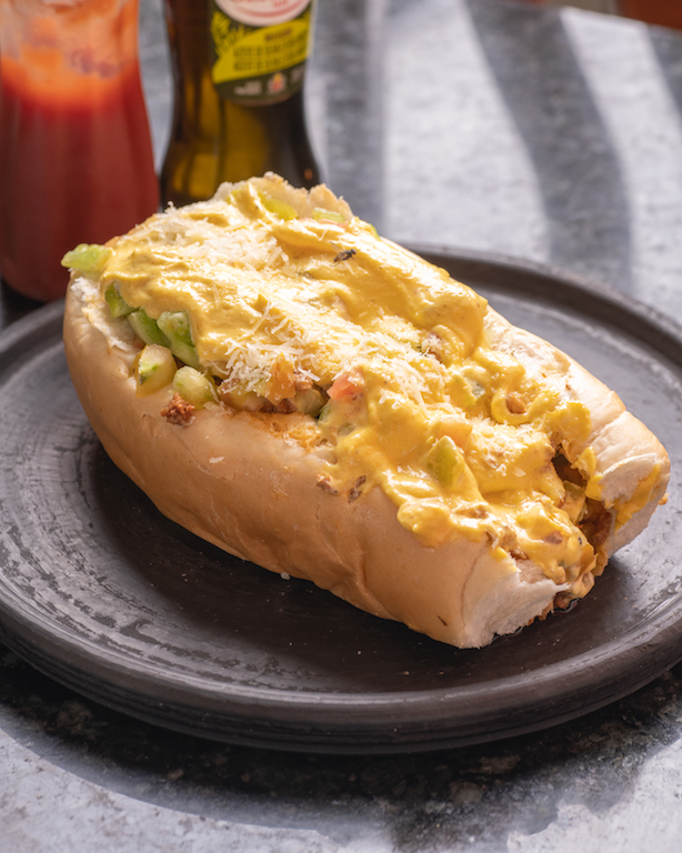Cachorro quente de carne moída com salsinha e queijo do reino no pão francês