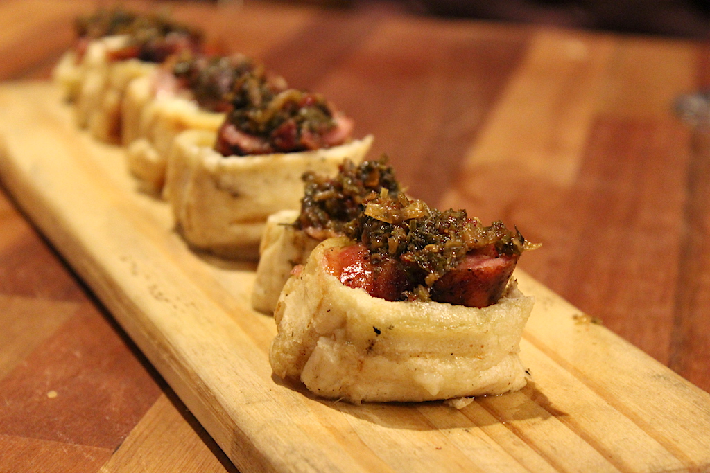 Chori pán – Pão cortado em rodelinhas, com pasta de alho, linguiça artesanal e o molho chimichurri