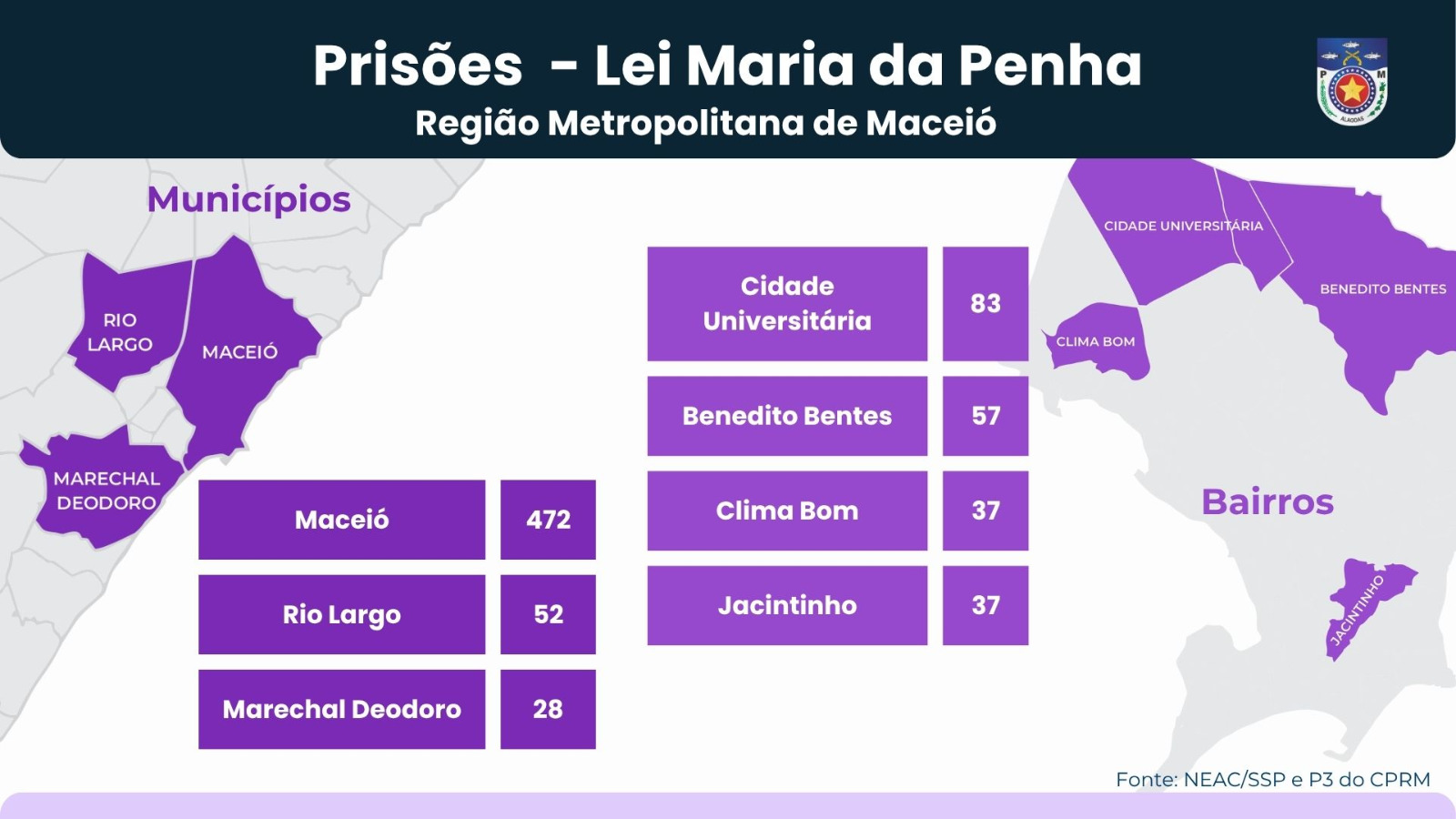 Entre os bairros, o maior quantitativo de prisões foi registrado na parte alta da capital: Na Cidade Universitária, foram 83 agressores presos. No Benedito Bentes, 57 autores de crimes relacionados à Lei Maria da Penha foram retirados de circulação. Empatados em terceiro lugar, estão os bairros do Jacintinho e Clima Bom, com 37 incidências.